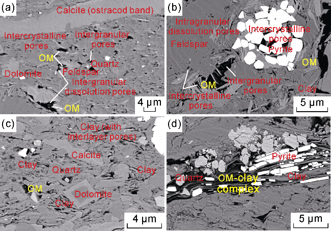 Fig. 6. Microscopic characteristics of pores in the K2qn1 shale. (a) Rigid framework composed of dolomite, felsic minerals and calcite bands, with intergranular dissolution pores, intergranular pores, and intercrystalline pores developed, Sample C2, 2 363.28 m, felsic shale. (b) Rigid framework consisting of felsic particles, with intergranular pores, intragranular dissolution pores and pyrite intercrystalline pores developed, some intergranular pores filled with OM or clay minerals, Sample C38, 2 374.21 m, felsic shale. (c) Developed clay aggregates with sporadically distributed quartz and dolomite, clay interlayer pores developed and partially filled with OM, Sample C20, 2 369.38 m, calcareous shale. (d) OM-clay complex formed by the OM filling the clay interlayers, Sample C148, 2 404.16 m, silty laminated felsic shale. |