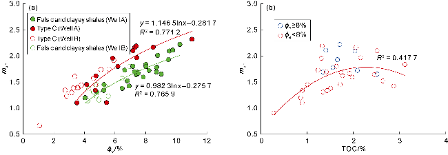 Fig. 8. Correlation between bound water cementation index and effective porosity or TOC (data in Fig. 8b are from Well A). |