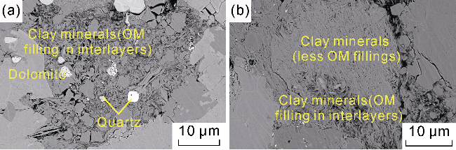 Fig. 9. OM filling heterogeneity of clay minerals. (a) Rigid minerals such as quartz and dolomite developed between clay aggregates, with significant OM filling in clay interlayers, Sample C166, 2 409.50 m, calcareous shale; TOC of 1.31%, clay content of 23.28%. (b) Local OM filling in clay interlayers, with underdeveloped rigid minerals between clay aggregates, Sample C148, 2 404.16 m, silty laminated felsic shale; TOC of 2.52%, clay content of 32.15%. |