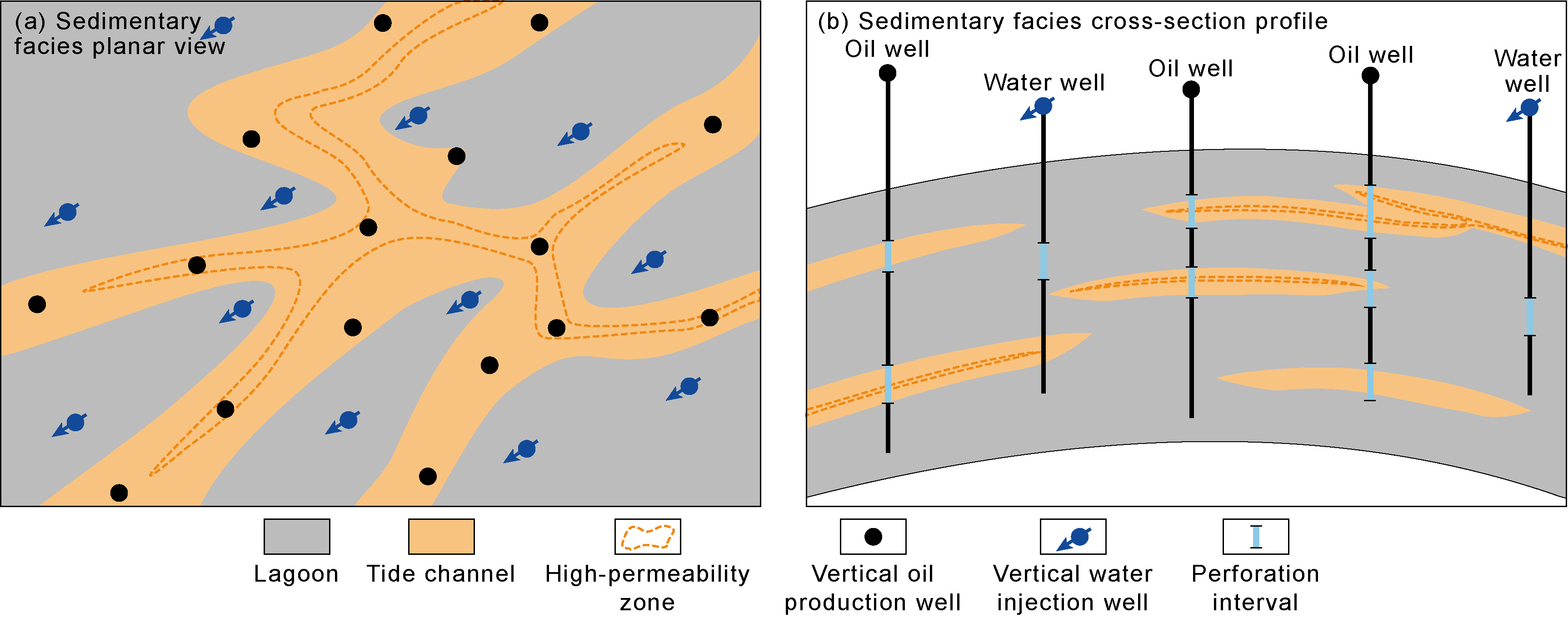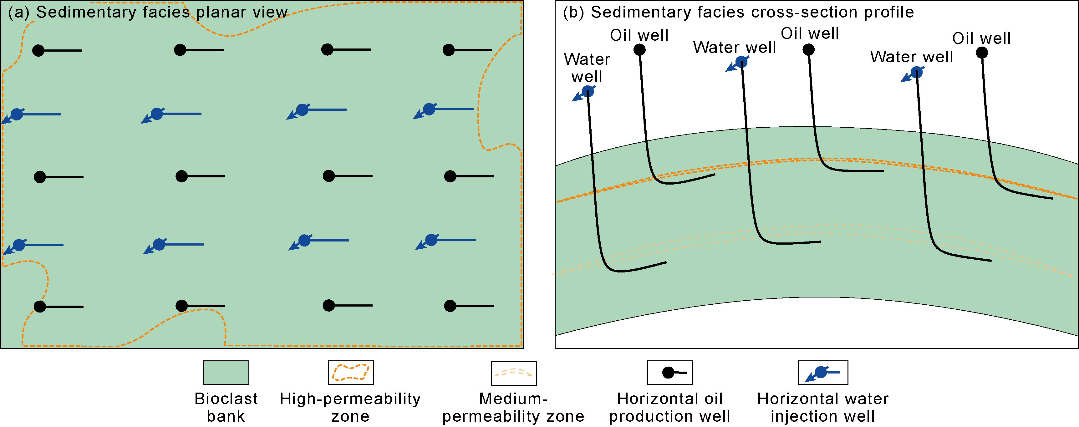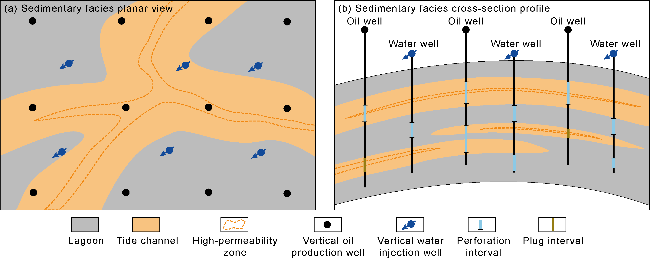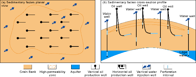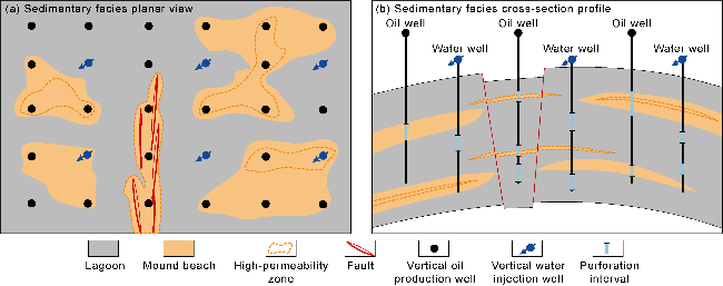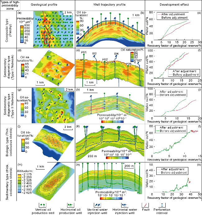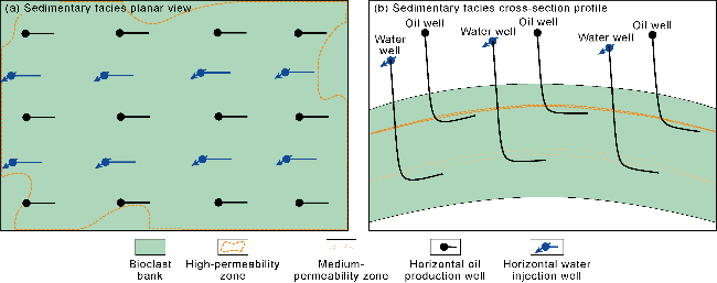 Biogenic HPZs typically occur as thin, continuous sheets, with relatively small thickness, large horizontal scale, and good connectivity. Injection and production wells are all within the plane of the HPZs. Injected water rapidly progresses along the HPZs, resulting in early water breakthrough for production wells (less than one year). Horizontal water injectors are often used for development. Production wells below the HPZs have a long water-free production period and a relatively slow rise in water cut, yielding the best development results. Wells across the HPZs have the second-best development results. Wells above the HPZs have the worst performance. When thin HPZs are developed within a reservoir, the injection wells are adjacent to the lower medium-permeability reservoir layer, and the production wells are located below the upper HPZs (