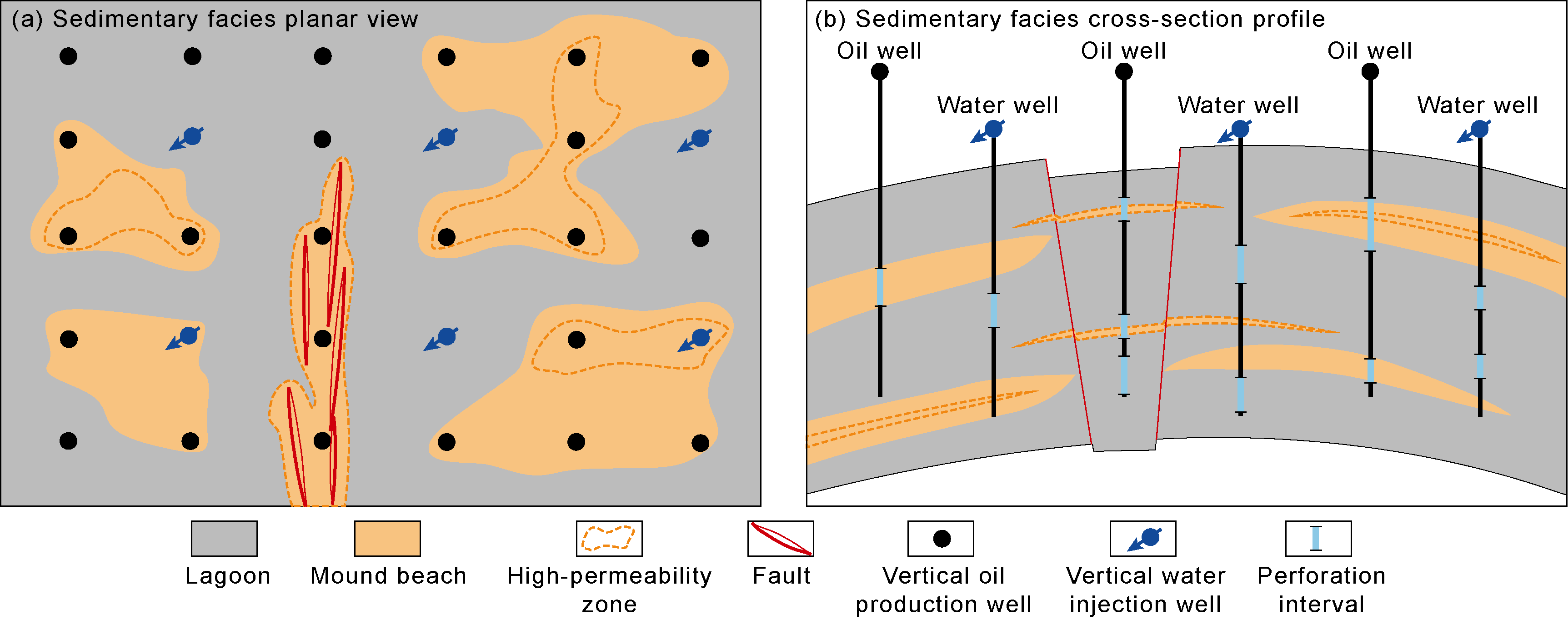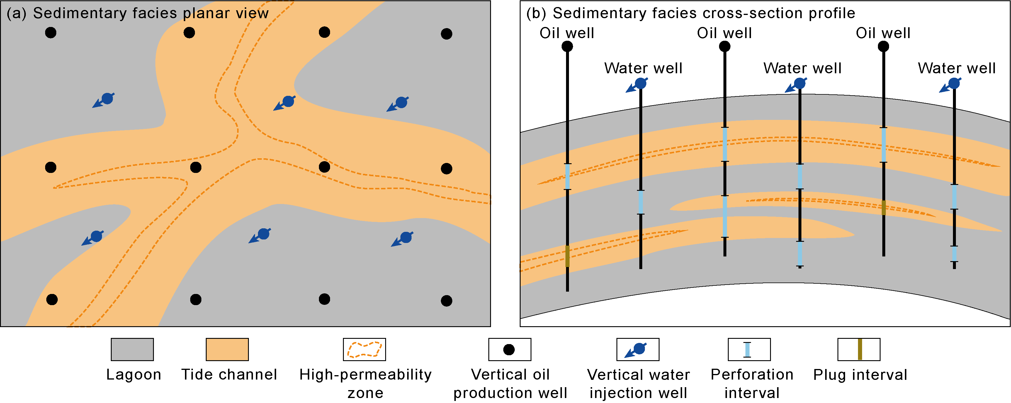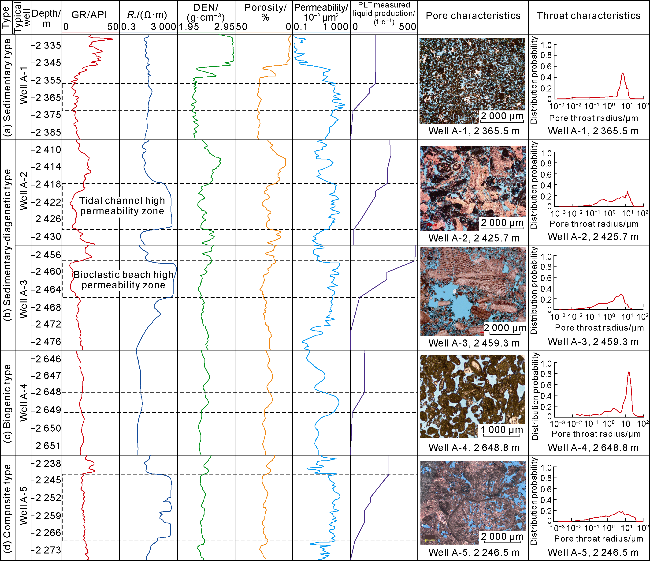 Biogenic HPZs typically occur as thin, continuous sheets, with relatively small thickness, large horizontal scale, and good connectivity. Injection and production wells are all within the plane of the HPZs. Injected water rapidly progresses along the HPZs, resulting in early water breakthrough for production wells (less than one year). Horizontal water injectors are often used for development. Production wells below the HPZs have a long water-free production period and a relatively slow rise in water cut, yielding the best development results. Wells across the HPZs have the second-best development results. Wells above the HPZs have the worst performance. When thin HPZs are developed within a reservoir, the injection wells are adjacent to the lower medium-permeability reservoir layer, and the production wells are located below the upper HPZs (