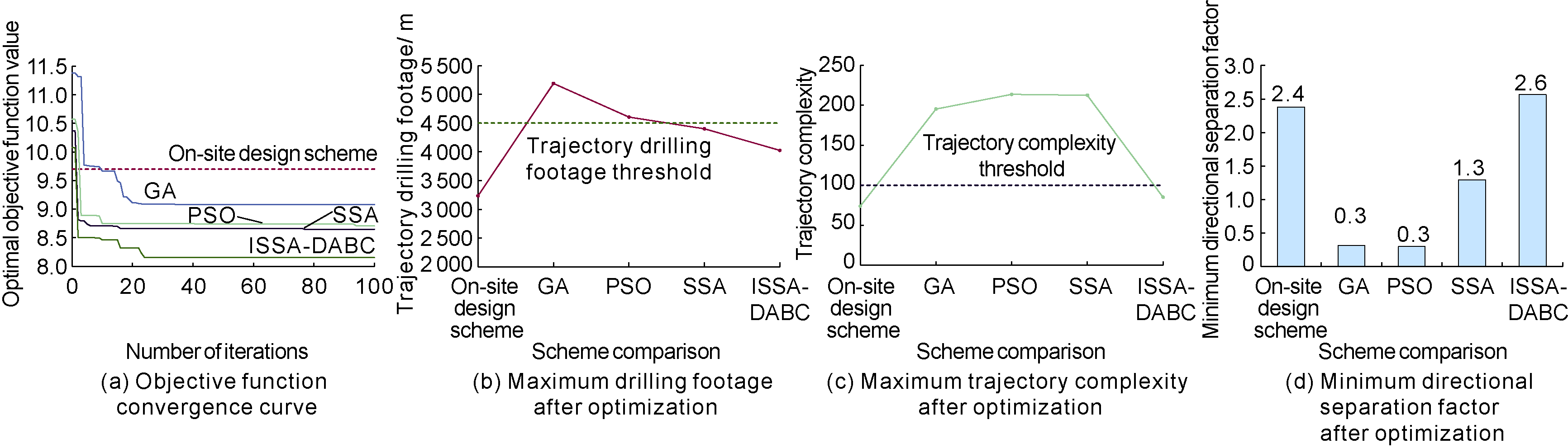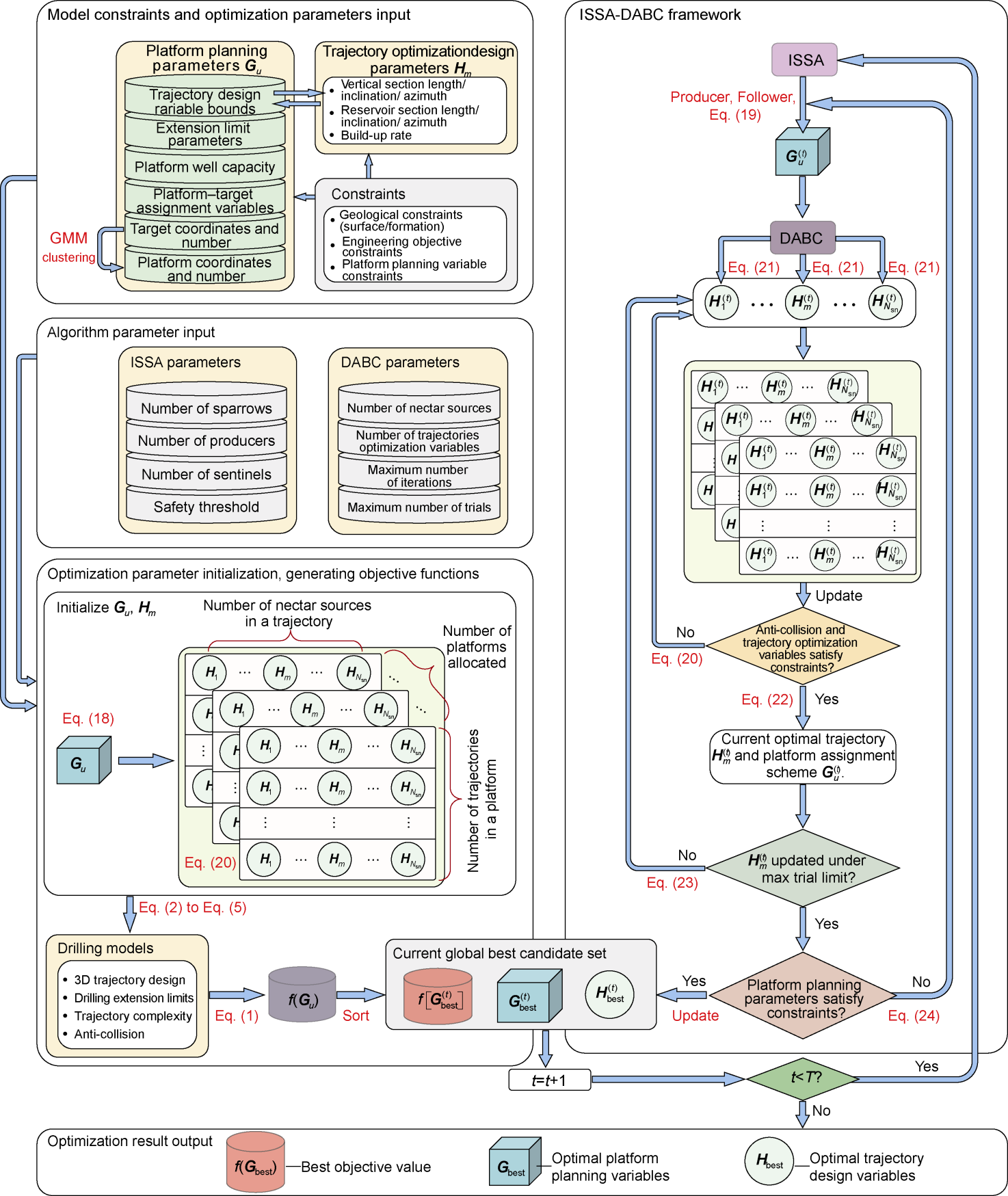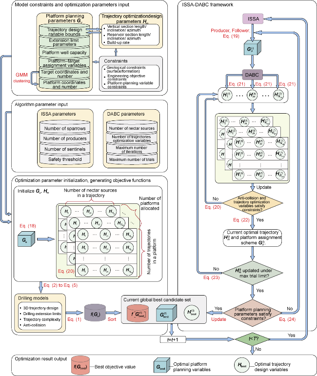 Using platform-target compatibility, collision pressure, trajectory complexity, and total drilling footage as objective functions, and comprehensively considering constraints such as platform layout area, drilling extension limits, underground target distribution, and trajectory collision risks, a model of platform location-wellbore trajectory collaborative optimization for a complex-structure well factory is developed. A hybrid heuristic algorithm is proposed by combining an improved sparrow search algorithm (ISSA) for optimizing platform parameters in the outer layer and a directed artificial bee colony algorithm (DABC) for optimizing trajectory parameters in the inner layer. This ISSA-DABC interaction facilitates the resolution of the collaborative optimization problem. The ISSA-DABC provides an effective solution to the platform-trajectory collaborative optimization problem for complex-structure well factories and overcomes the tendency of the traditional platform-trajectory stepwise optimization workflow to become trapped in local optima and yield inconsistent designs. The ISSA-DABC achieves a strong global search capability, fast convergence, and good robustness, can simultaneously satisfy multiple engineering constraints on drilling footage, trajectory complexity, and collision risk, and enables automated, workflow-wide generation of constraint-compliant, near-globally optimal platform-trajectory configurations. Field applications further demonstrate that ISSA-DABC significantly reduces the objective function value and collision risk, yielding more rational platform layouts and well factory design parameters.